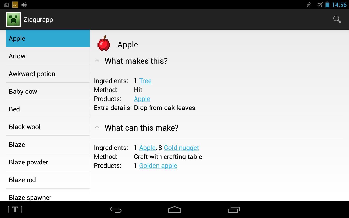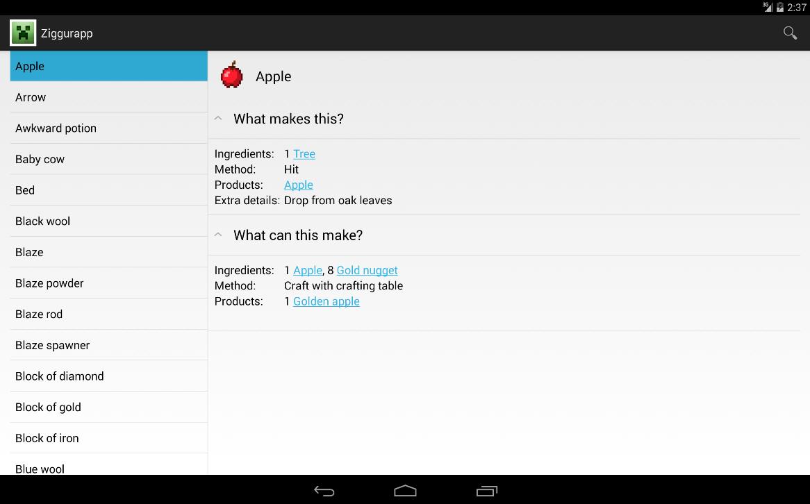 Узнайте, как сделать предметы Minecraft, и что вы можете сделать с этими предметами. Рецепты гиперссыщенные, поэтому вы всегда можете получить от сложного предмета обратно к более простому. Все данные хранятся в приложении, поэтому Wi -Fi не требуется.